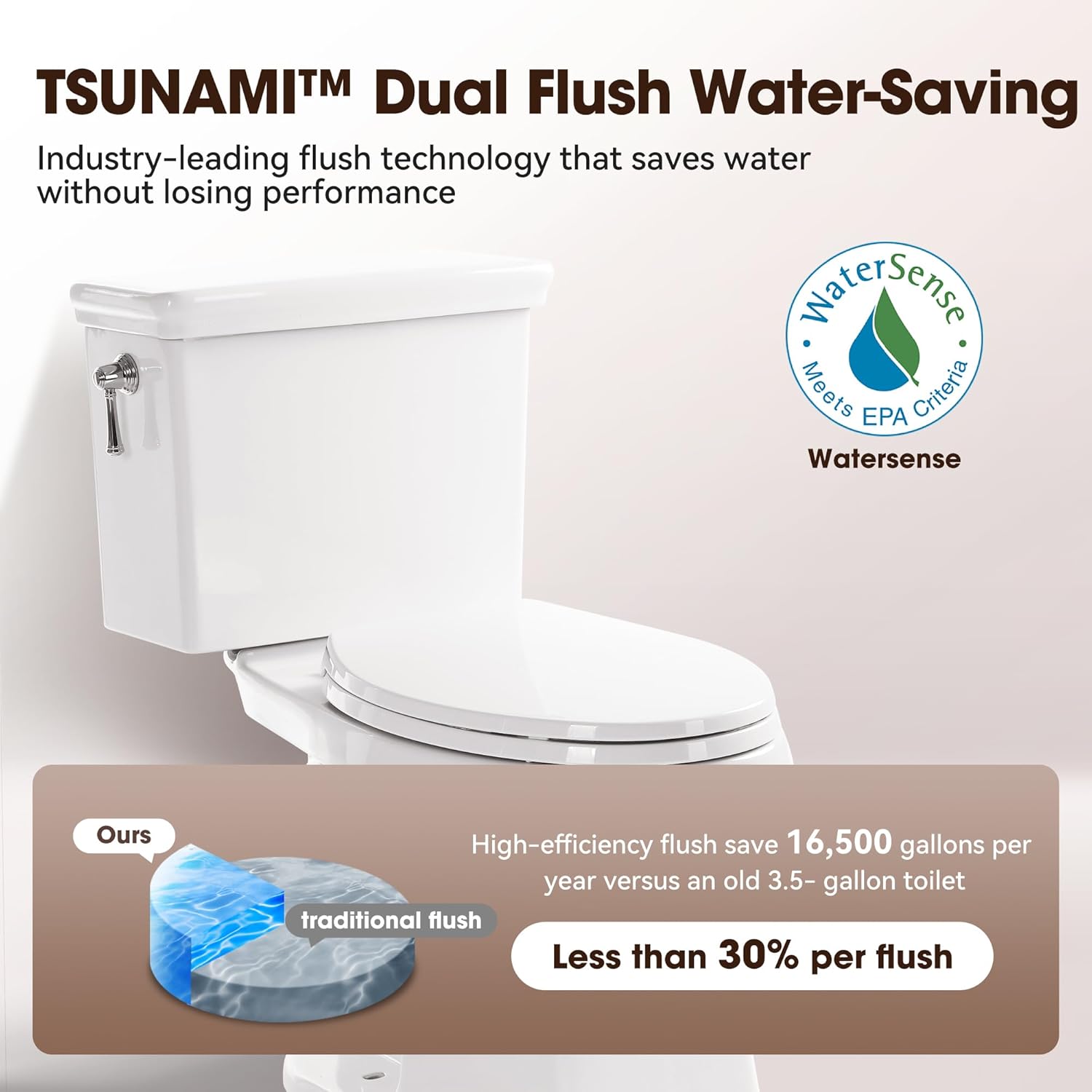 - 【360° TSUNAMI Flush】: An industry-leading gravity flush system that generates a powerful vortex push to effectively eliminate waste. This advanced flush technology is designed to save water without compromising performance, boasting a WaterSense certification and an impressive 1000 Gram Map Flushing Score. Experience a cleaner, more efficient way to maintain restroom hygiene.
