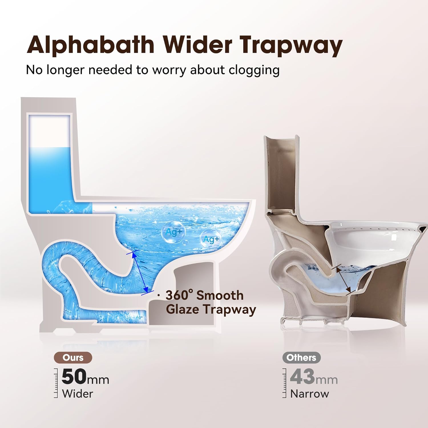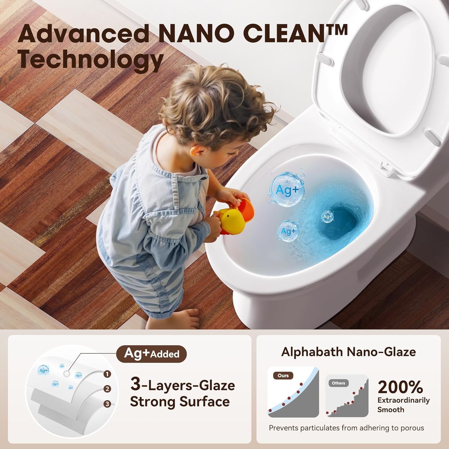 - 【Advanced NANO CLEAN Technology】: the Alphabath power flush toilet features a 3-layer glaze with three strong surfaces, providing a remarkably smooth finish that prevents particulates from adhering to porous surfaces by 200%