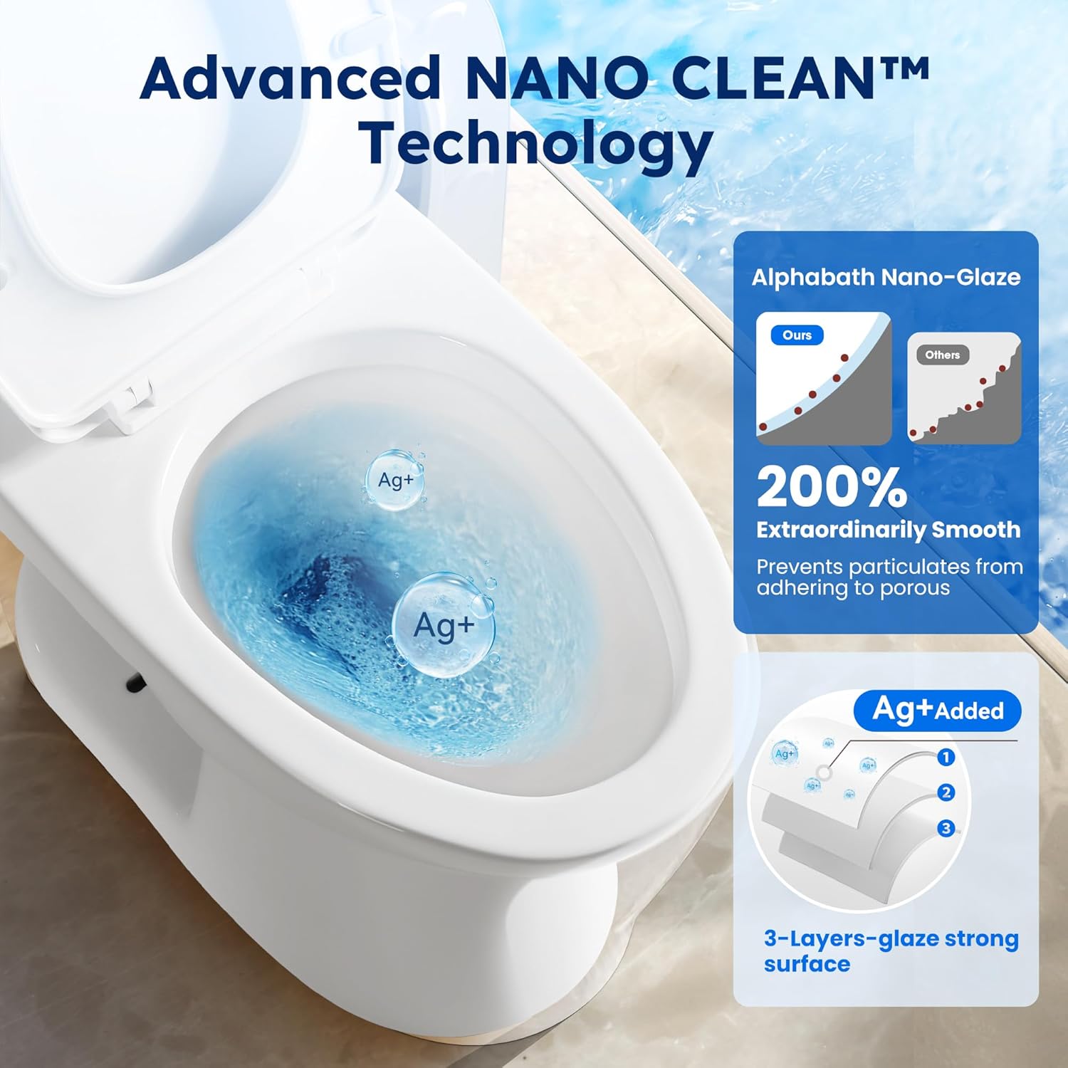 - Self-Cleaning Ceramic & Enlarged Drain Diameter - Low Absorption:The NANO CLEAN patented ceramic technology features a 3-layer glazed piping system infused with natural silver ions, reducing cleaning efforts without harm. This ensures a smooth, aesthetically pleasing, and durable surface.The 50mm enlarged drainage diameter allows for smoother flushing, while a water absorption rate of ≤ 0.5% minimizes the risk of swelling, warping, or cracking
