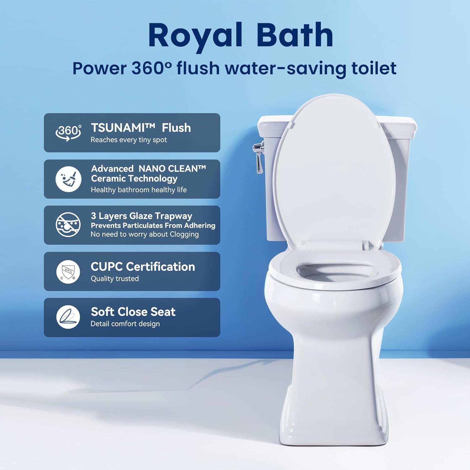 - 360° TSUNAMI Flush & Fully Ceramic-Coated Drainage Pipes:Featuring an industry-leading 360°powerful jet siphonic flushing system, this two-piece toilet ensures thorough flushing with no dead spots. The fully ceramic-coated drainage pipes create a smooth, non-porous surface that resists stains and minimizes clogs. This design simplifies cleaning. The high-temperature glazing enhances the durability of the ceramic and prevents limescale buildup, extending the toilet’s lifespan