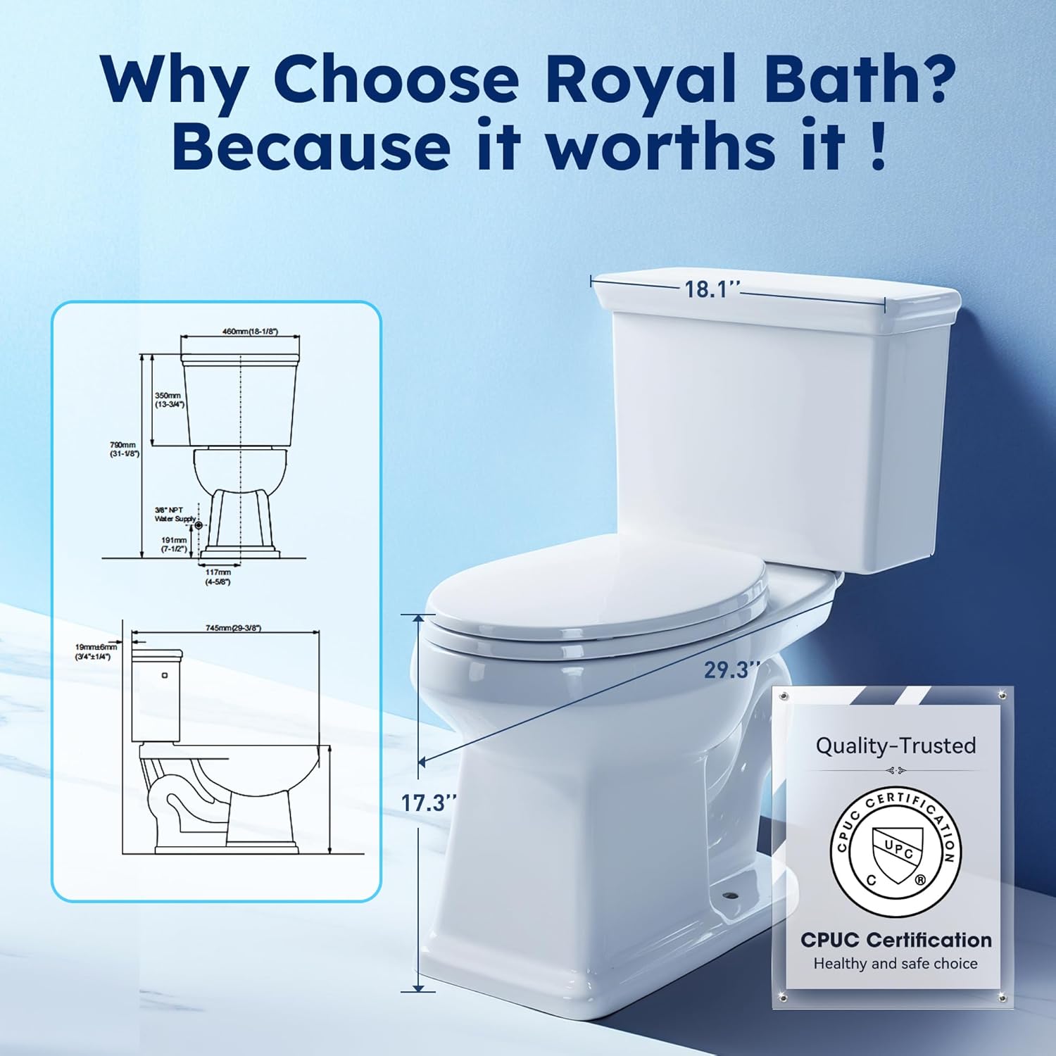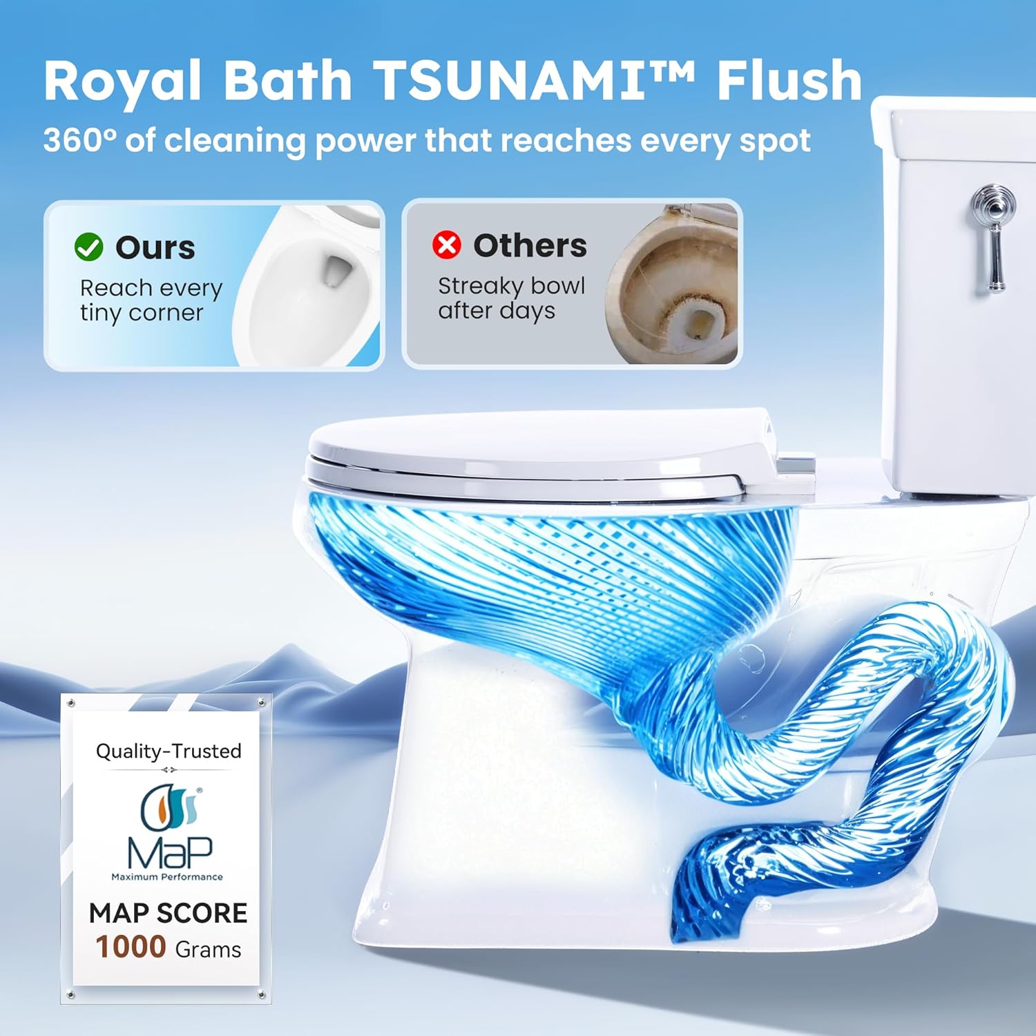 - MAP Certified Waste Extraction Performance & CUPC Certified:MAP certification indicates that a specific toilet has been tested for maximum performance, capable of discharging 1000 grams of waste in a single flush, demonstrating superior waste extraction ability. CUPC certification provides higher safety assurance, utilizing high-standard materials that enhance the product’s durability and reliability while minimizing its negative impact on the environment as much as possible