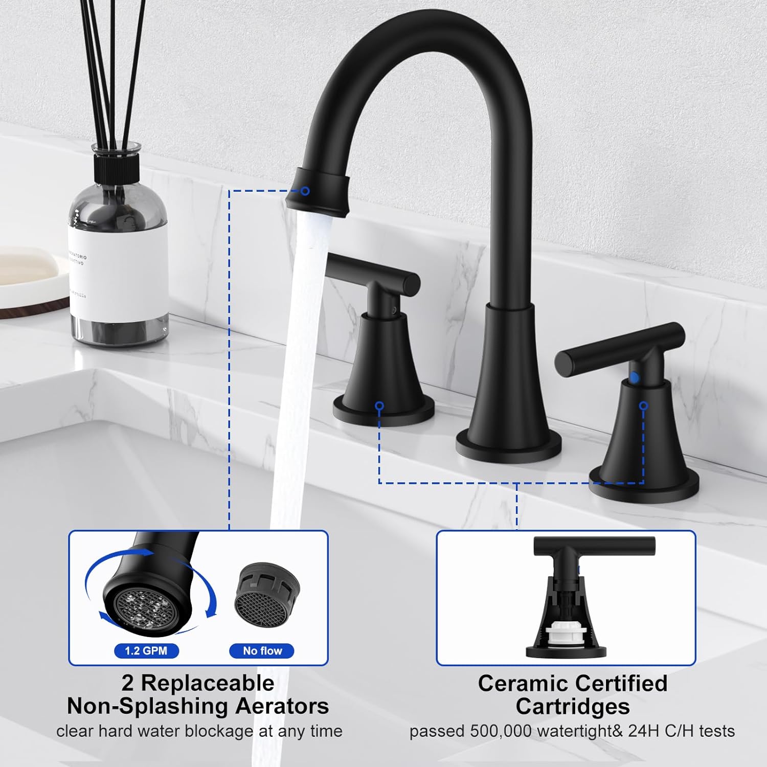 | Included Components | Matte Black Widespread Bathroom Sink Faucet, 2 Hot/Cold Handle Assembly, Pop Up Drain, Fast Connect "Y" Shaped Hose, No Flow Aerator See more |
