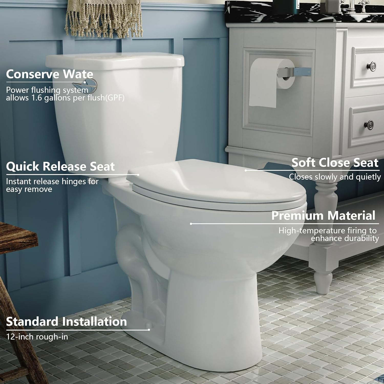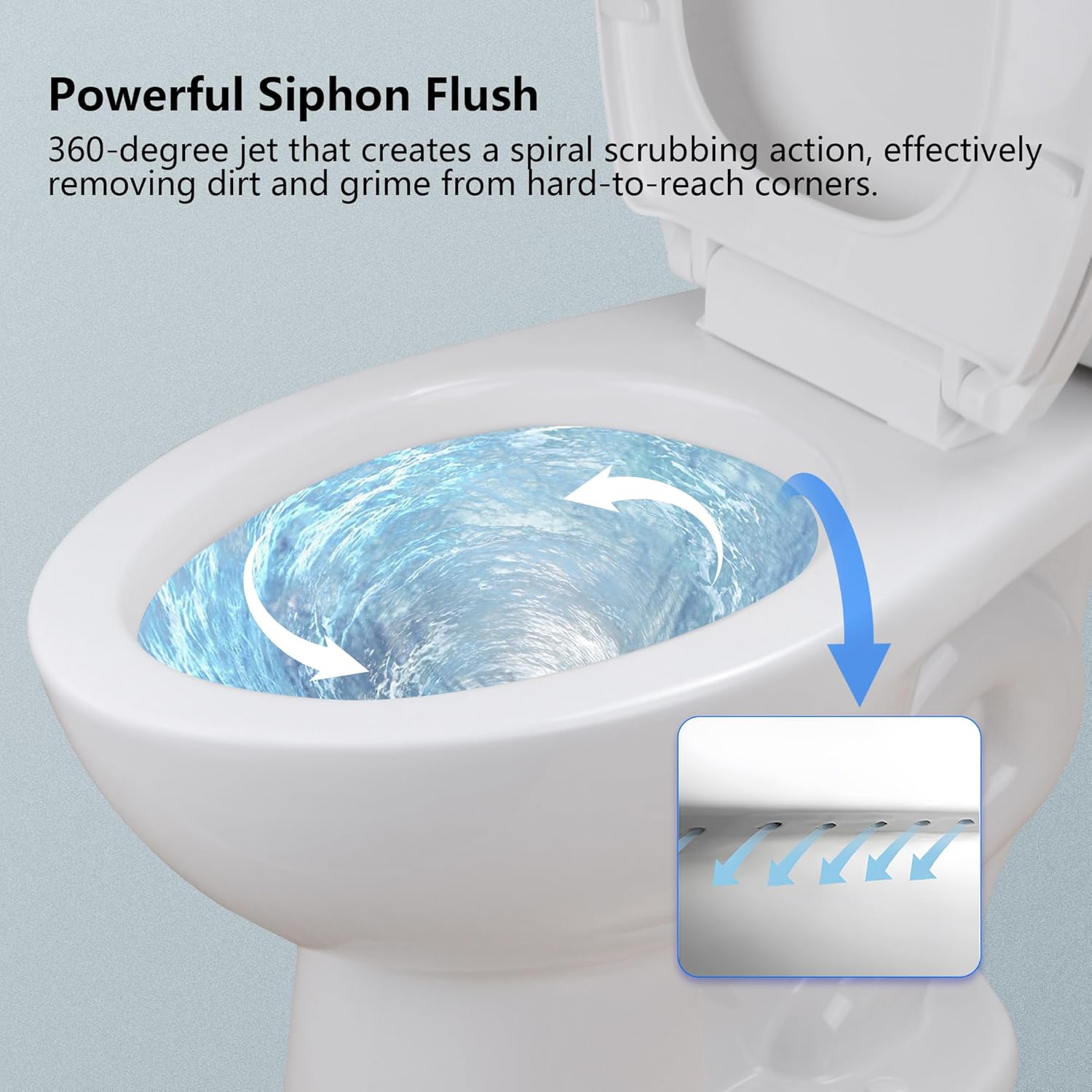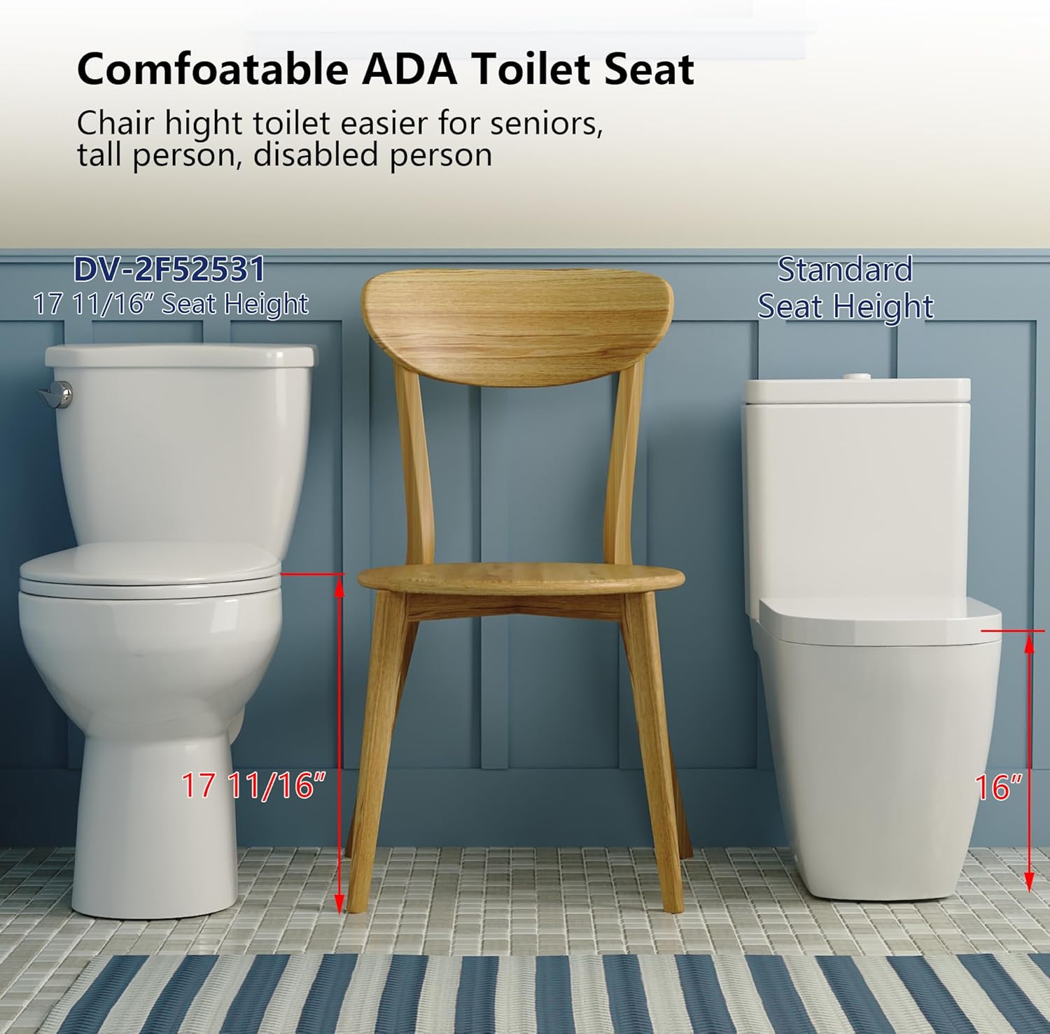 - ADA Toilet Height Seat: Our two-piece toilet is meticulously designed with a seat height of 17 15/16 inches from the floor, offering a more comfortable experience by reducing strain when sitting down or standing up.