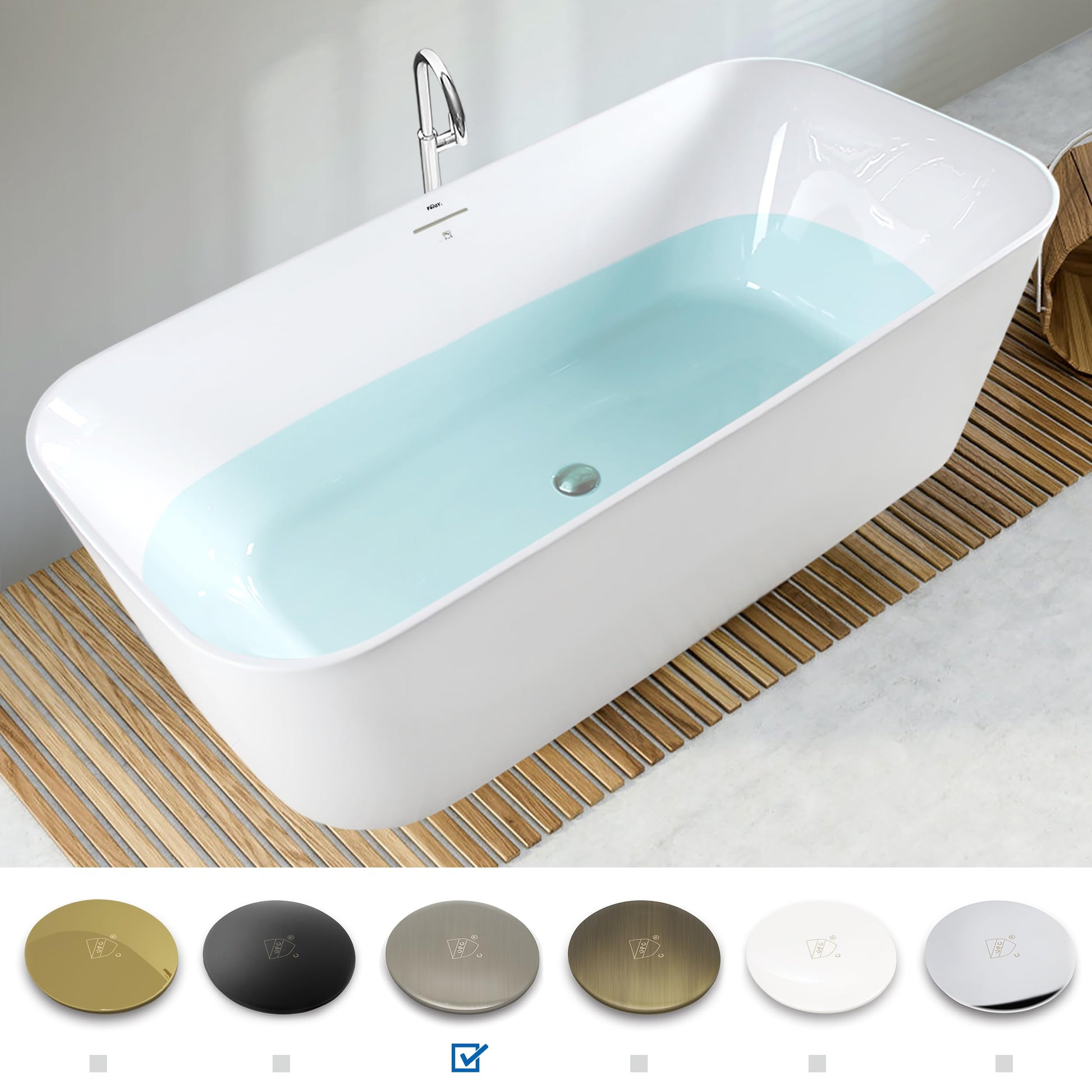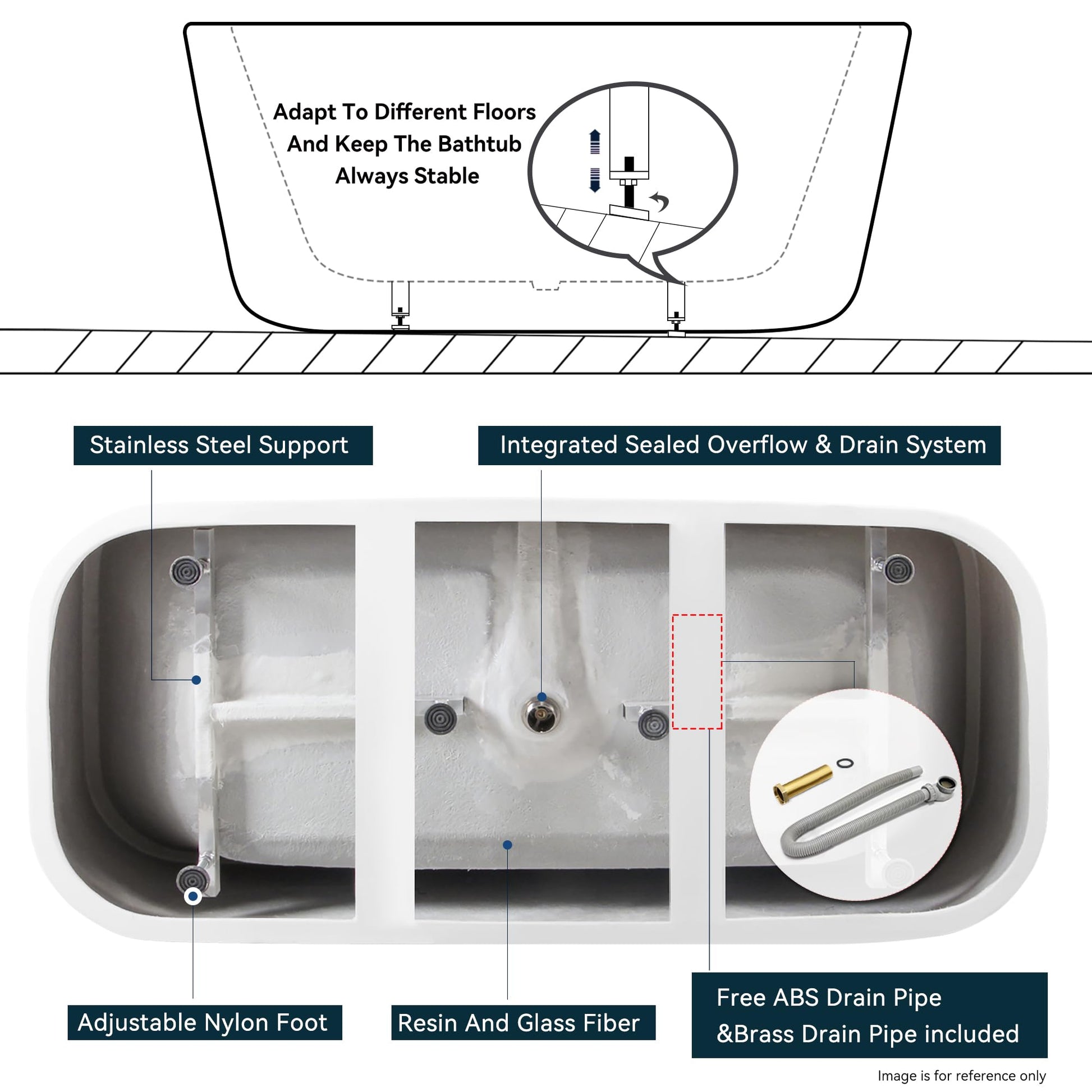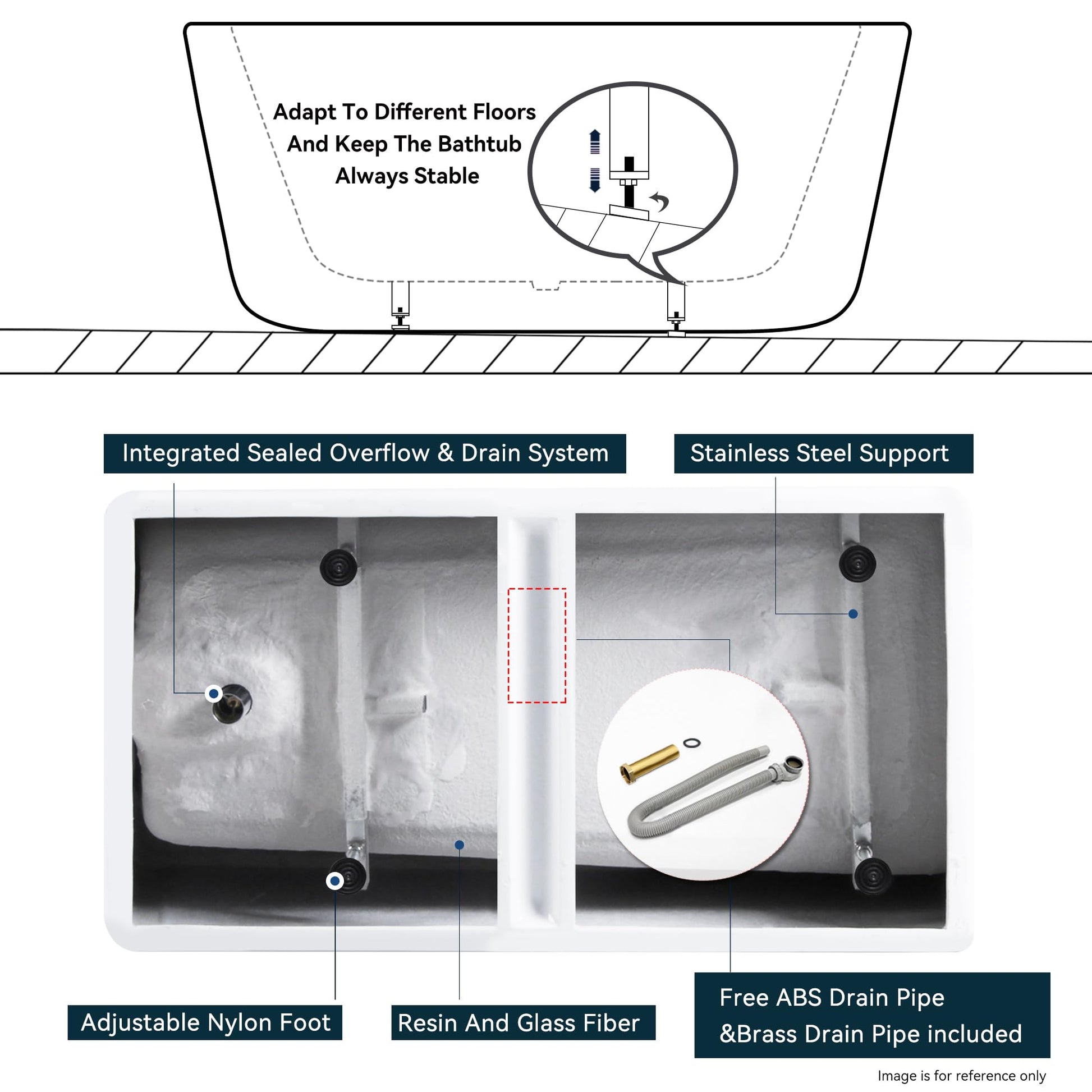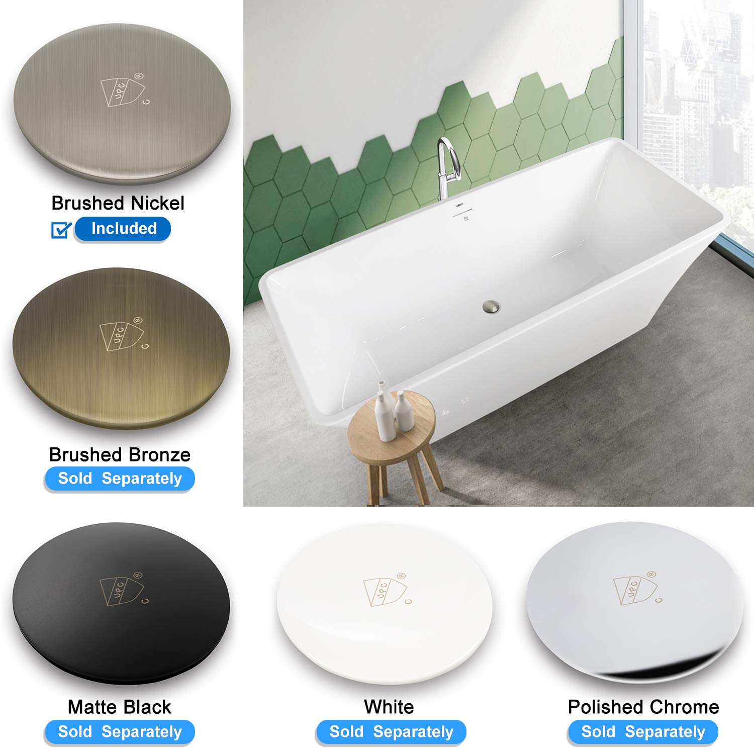 - š EASY INSTALLATION: Illustrated guide with step-by-step instructions makes installation easy. Adjustable leveling feet are included to stabilize the tub to any surface. The bathtub has been pre-installed with a brushed nickel drain. Plastic and brass drainpipes can be found on the inner sides of the bathtub. In addition, 4 additional options for the drain stopper sold separately, contact us to order the drain stopper that best suits your bathroom design.