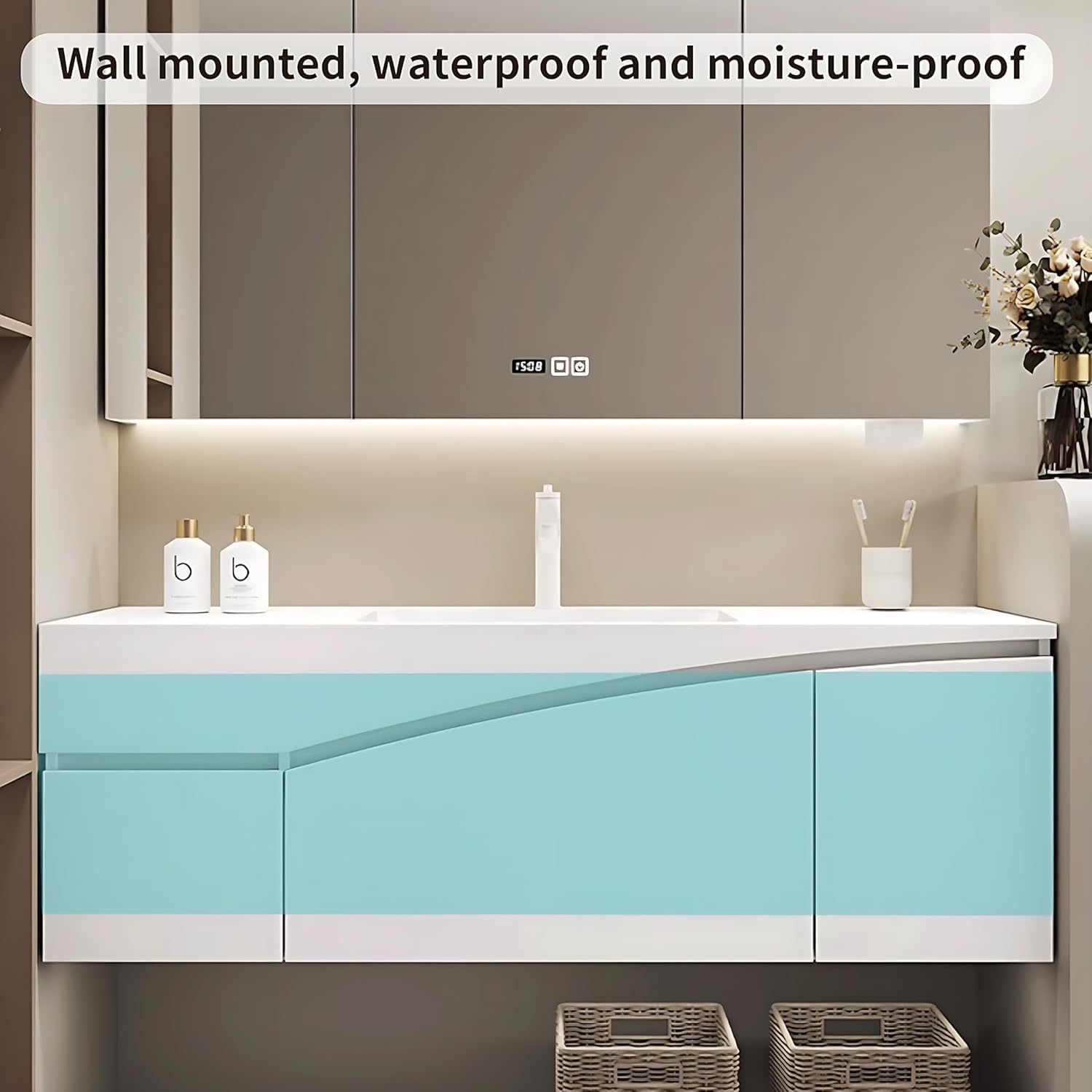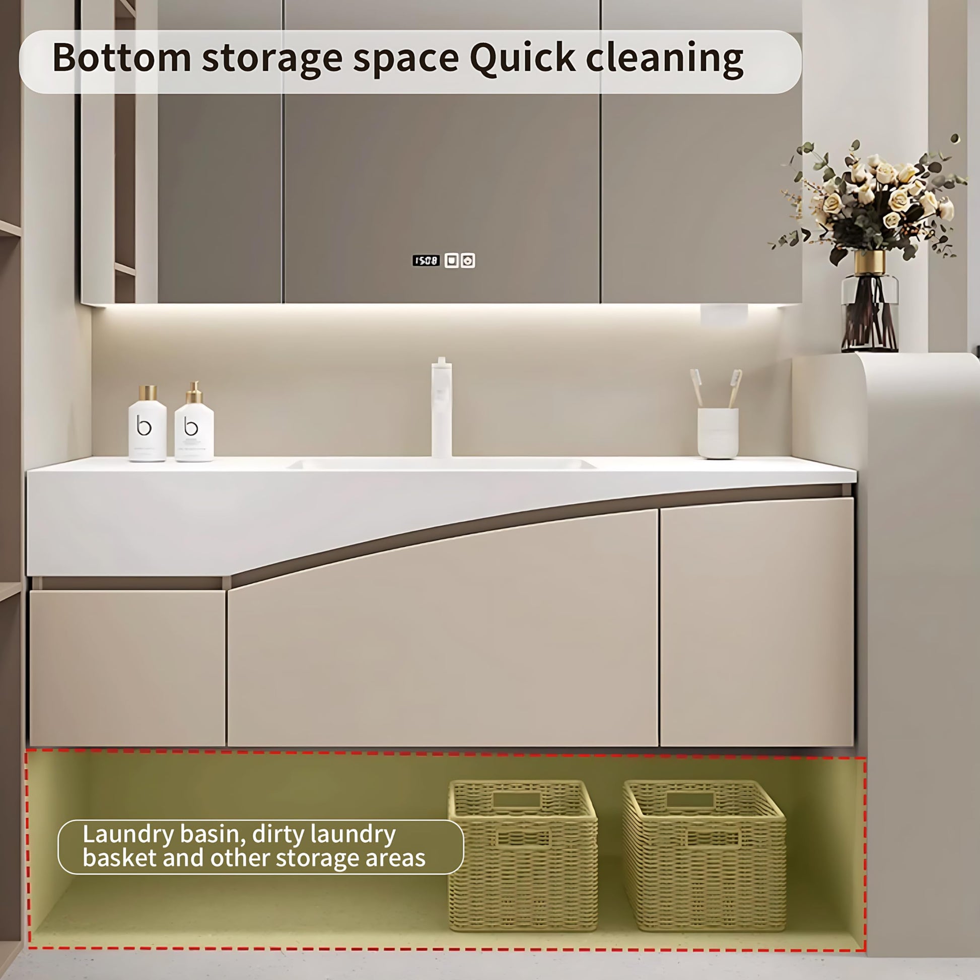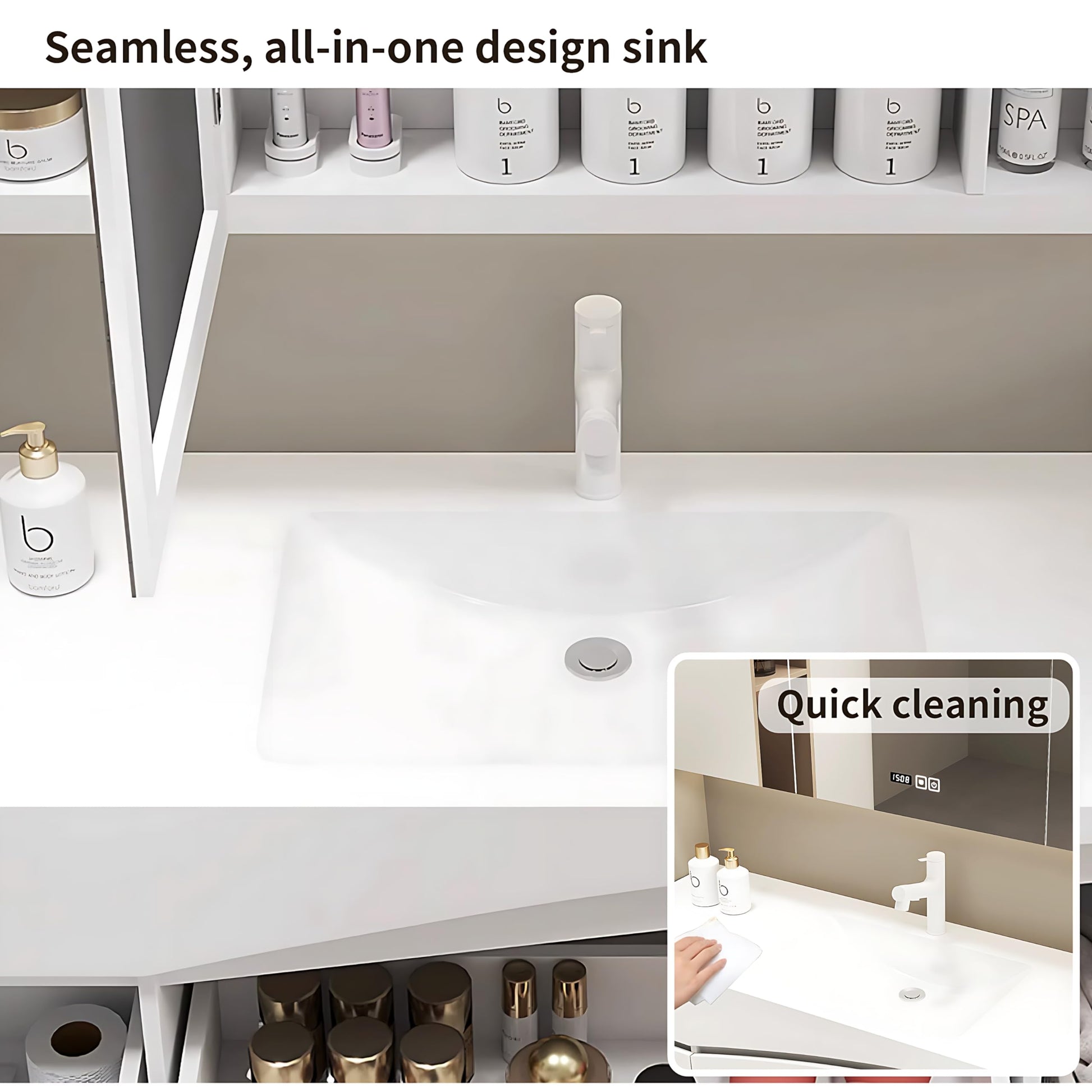 - Seamless sink: The bathroom vanity provides a large-capacity sink. The sink adopts a seamless manufacturing process to make cleaning easier and faster. There is ample water storage space to easily meet your various cleaning needs. Immerse yourself in a seamless blend of design and functionality.