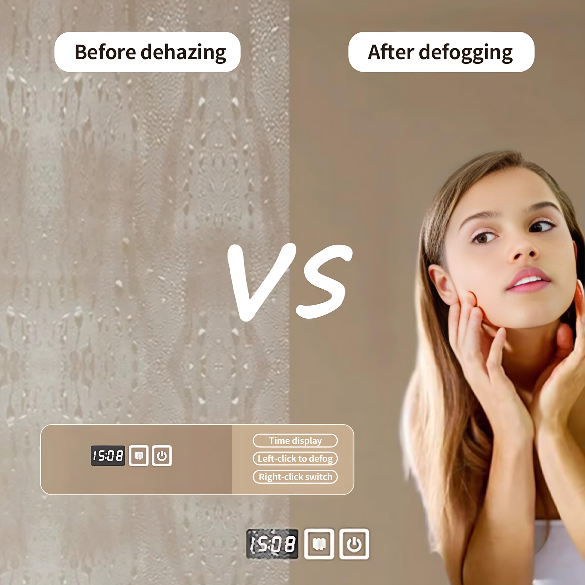 - LED smart defogger mirror: The smart LED defogger mirror matched with the bathroom vanity can instantly remove the water mist on the mirror after bathing. It can be controlled with one button and combined with the illumination of LED lights to make the image clearer and broader.