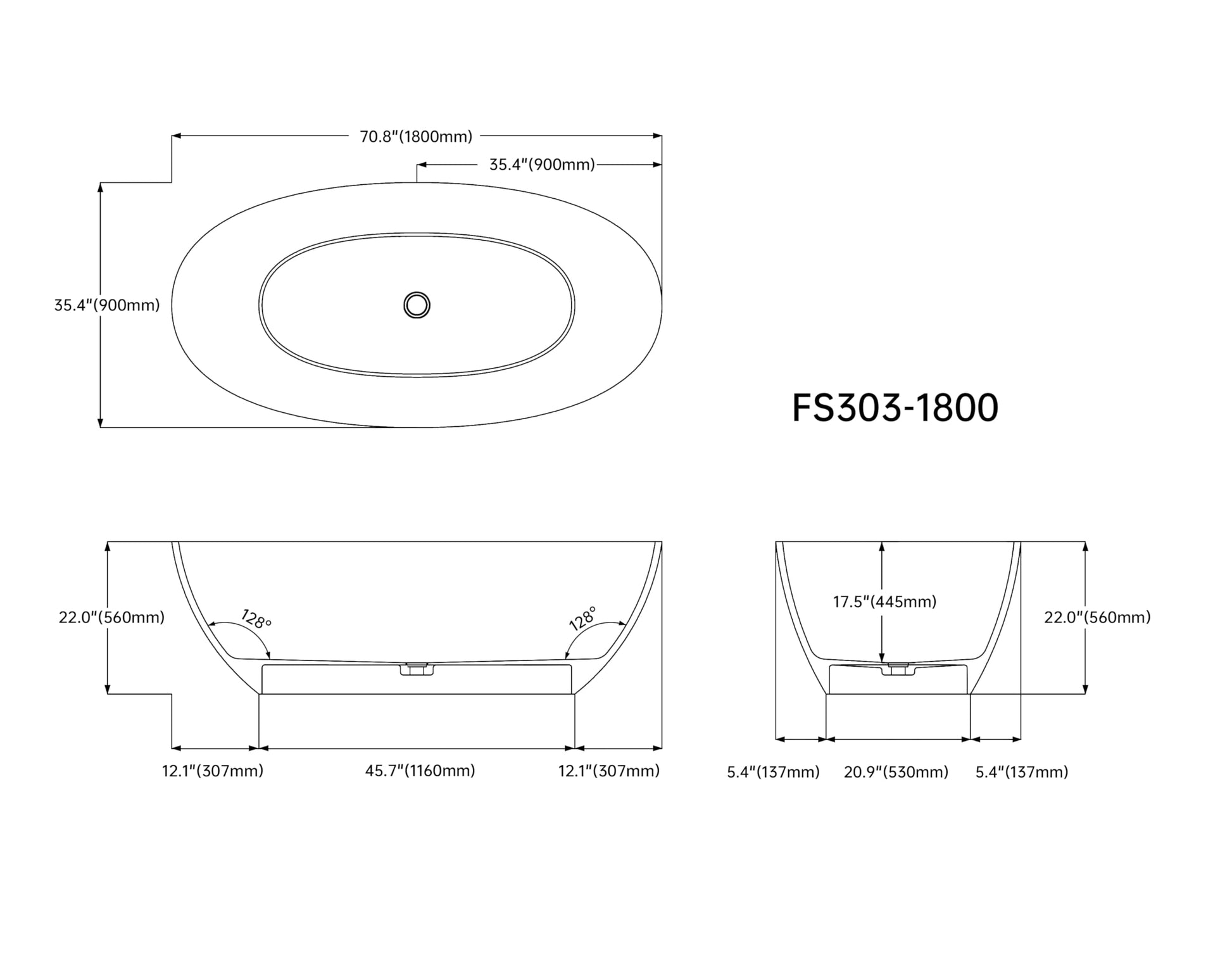 - Exterior Dimension: 70.86"(L) x 35.4"(W) x 22.04"(H) , Weight :216 pounds.Bathtub wall thickness is 0.79 inches