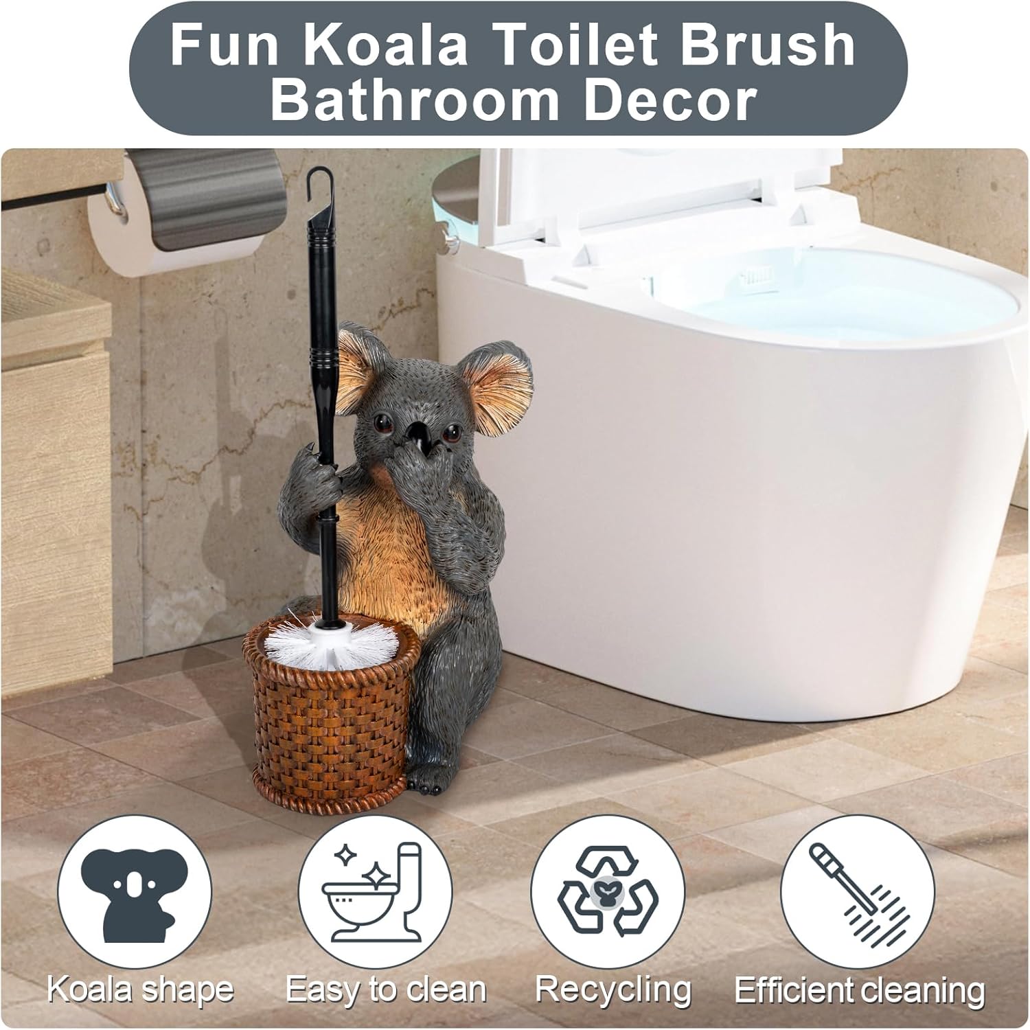 - 🐨【Unique Modern Design】Unique Koala Design Toilet Bowl Brush Is Super Cute, Resin Material Fashionable And Textured Shape, Toilet Brush With Holder Brings Warm And Tidy New Home Experience To The Bathroom. This Koala Decorative Toilet Brushes & Holders Has Been Professionally Designed To Make Your Bathroom More Modern And Stylish