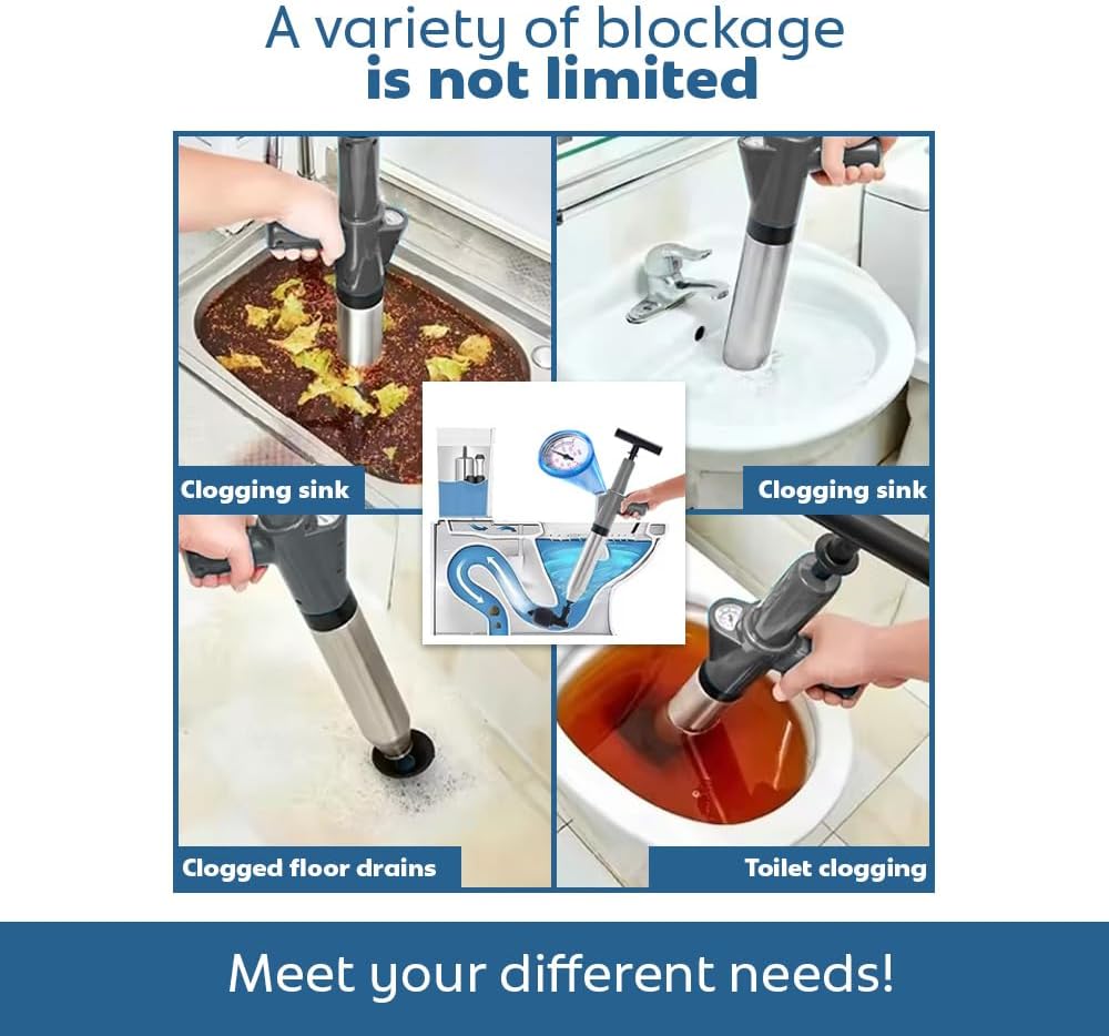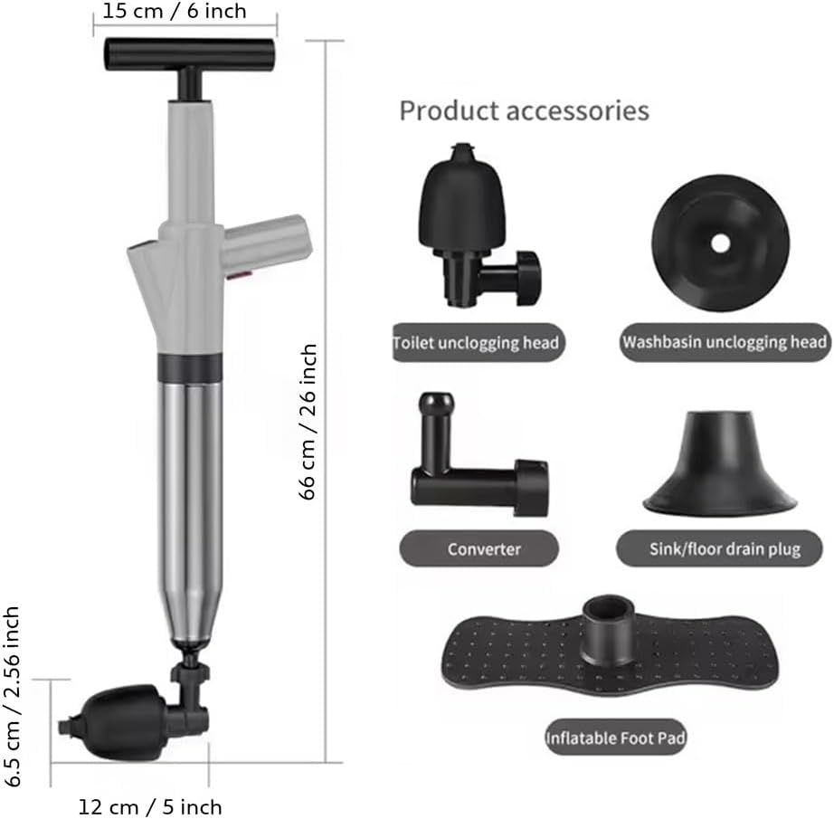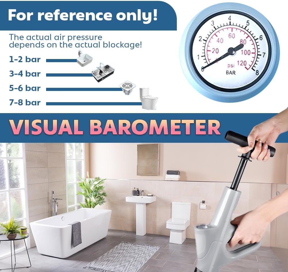 - HIGH-PRESSURE AIR TECHNOLOGY: It uses high pressure air technology to remove stubborn blockages and ensure smooth water flow. With its 8bar/120psi power, it provides a more effective solution than traditional pumps. In addition, it is more resistant to high pressure than pumps made of plastic material, and thus it can be used safely without the risk of explosion due to blockages.