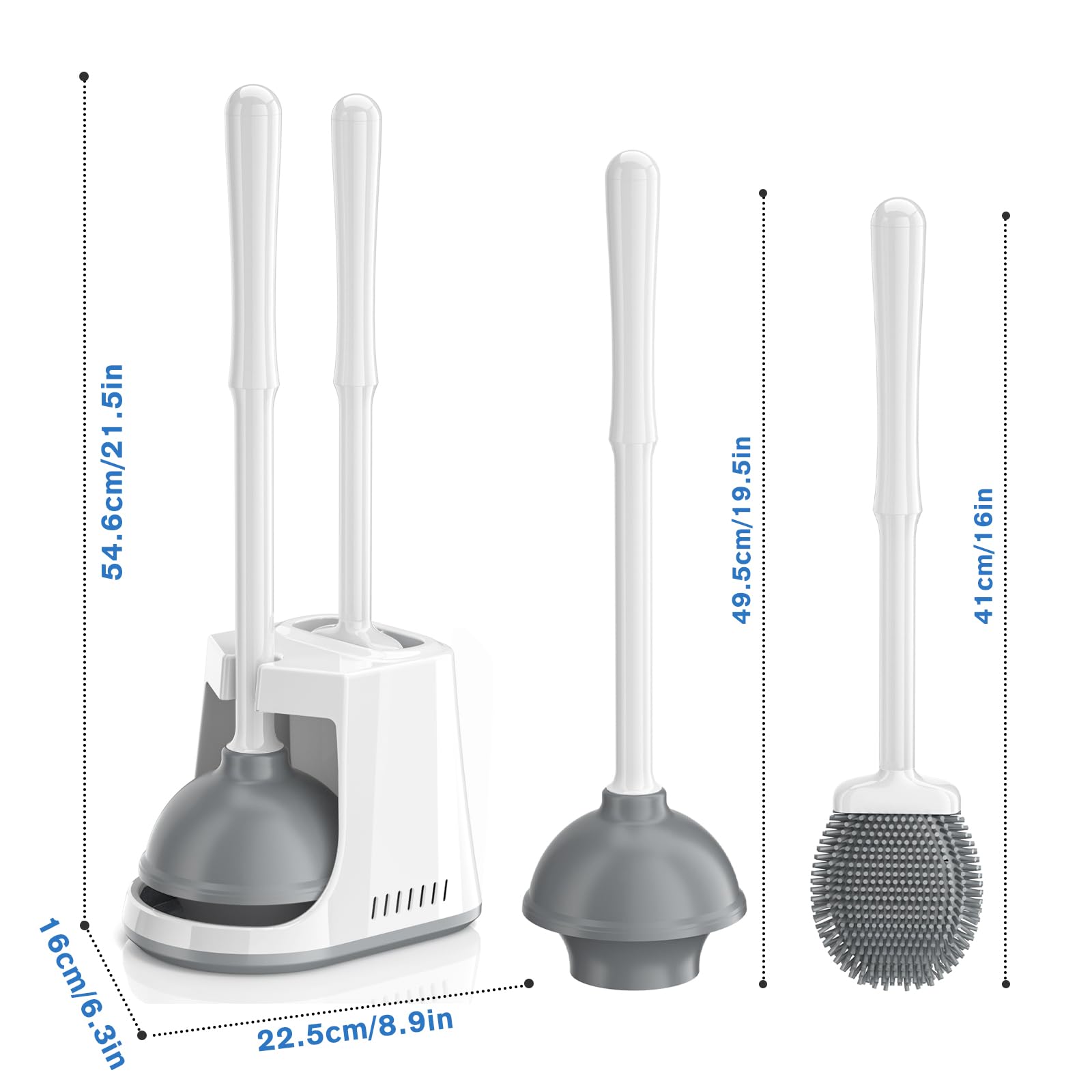 - TOILET PLUNGER AND BRUSH SET: This new toilet plunger and flex silicone toilet brush set is the perfect tool for your toilet cleaning. Flexible toilet brush and powerful toilet plunger make it easy to handle heavy cleaning and plunging. Stylish design and compact storage keep your bathroom neat and clean.
