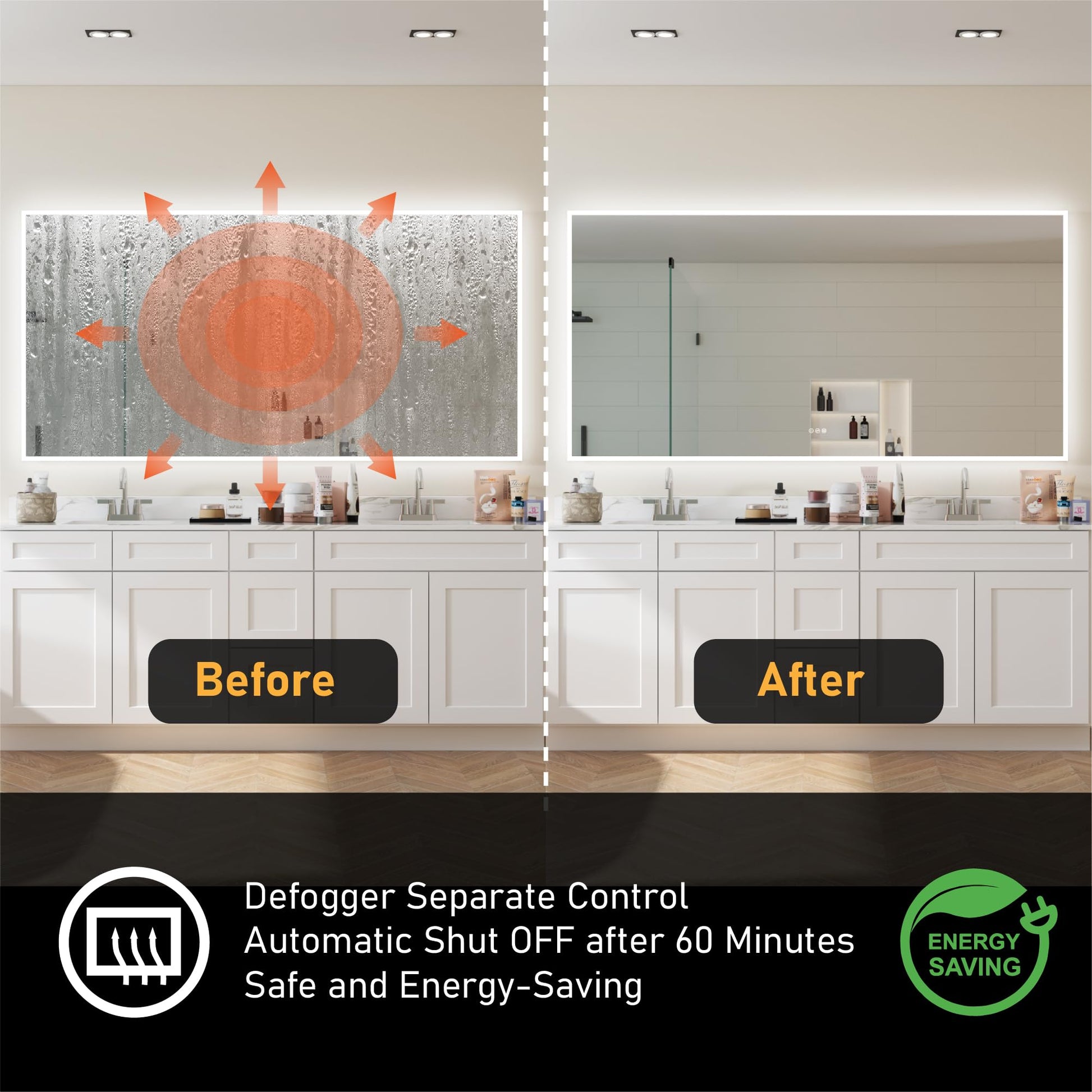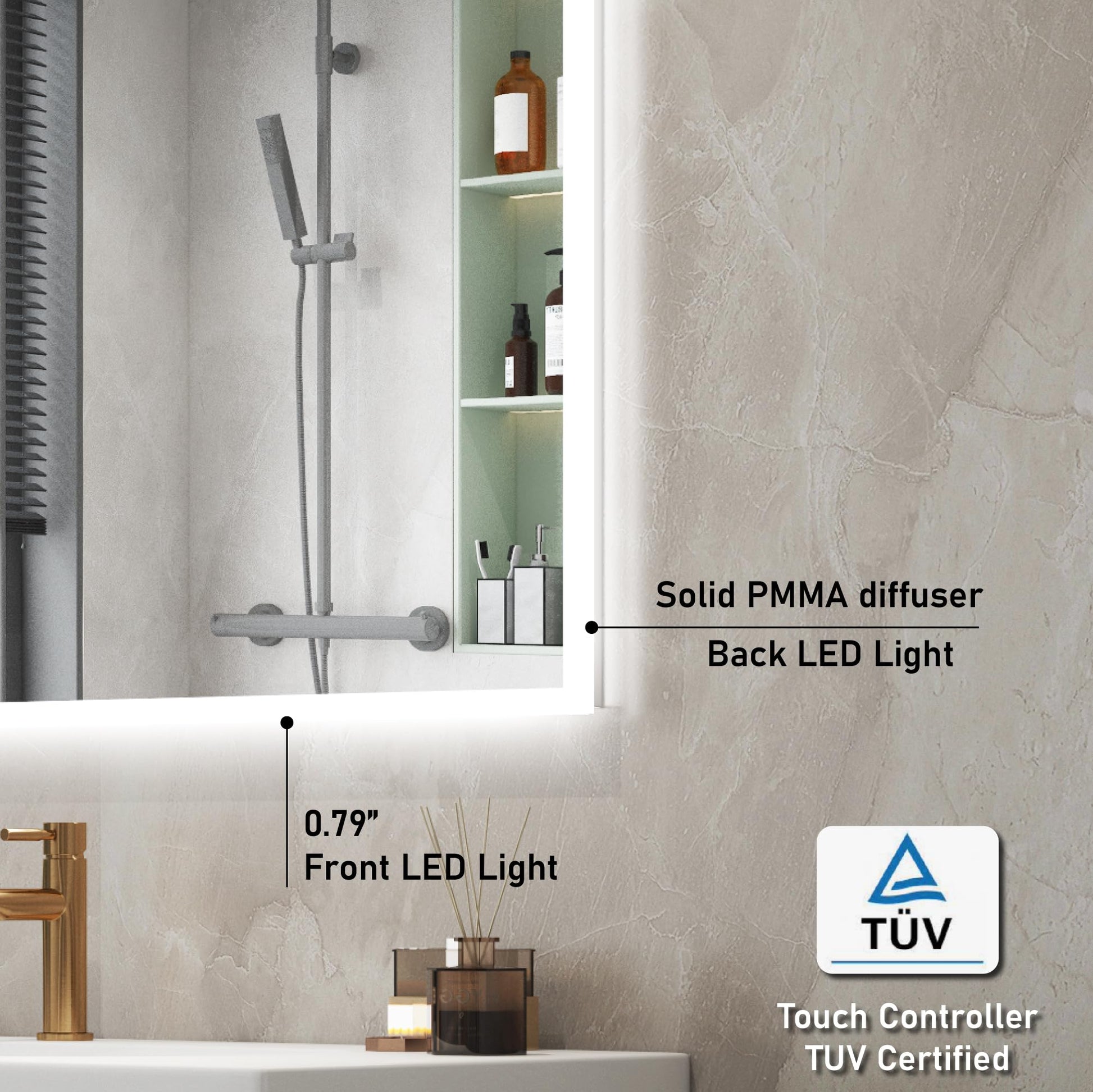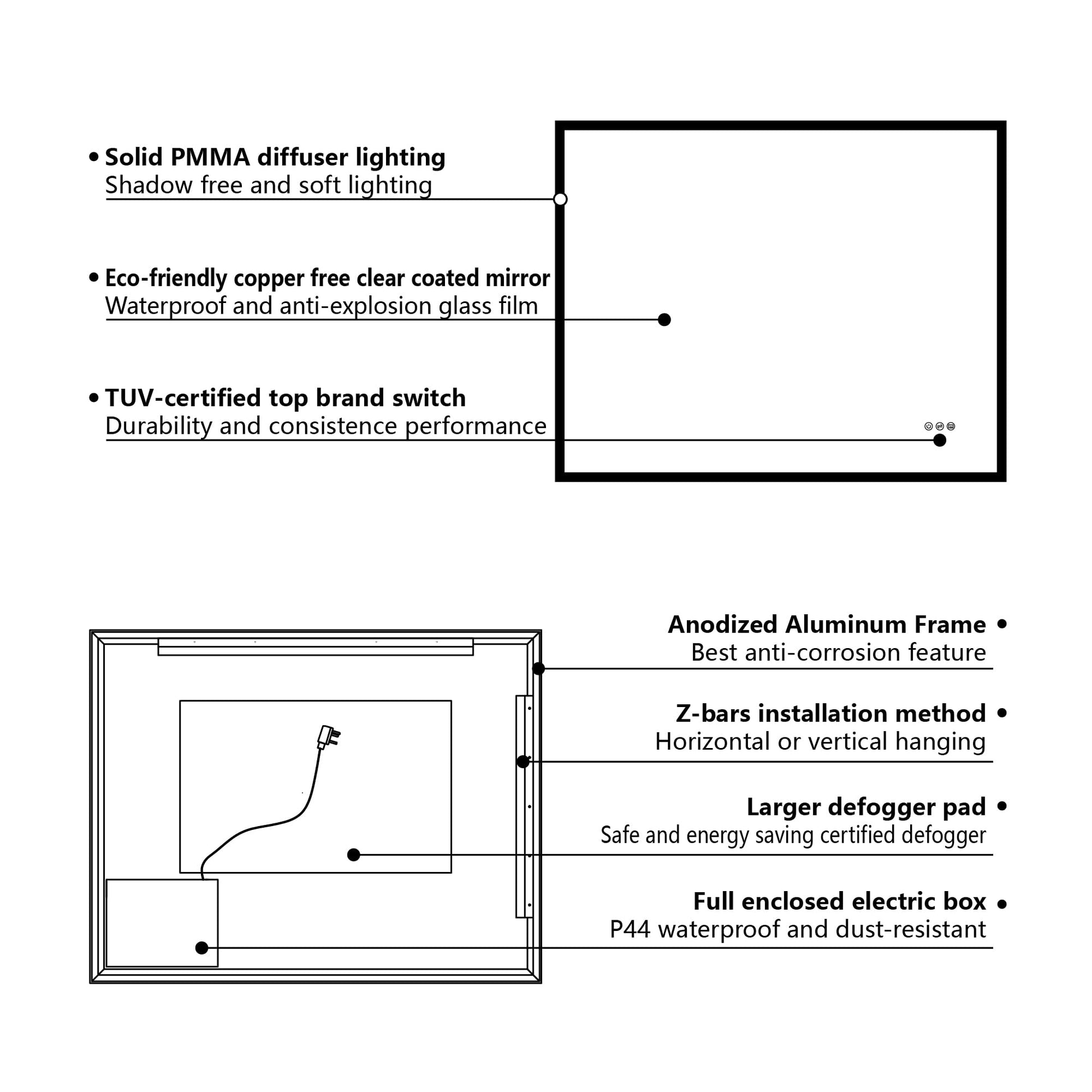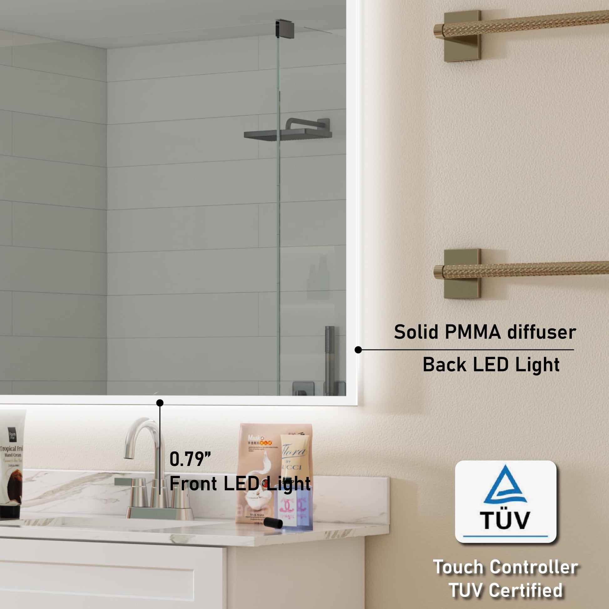 - Even and Gentle Illumination: Our LED mirror for bathroom is equipped with solid PMMA diffuser LED lighting fixtures, ensuring that light is evenly and softly distributed. And brightness at 2200 lumens ensures consistent lighting with no hot spots or dark spots.