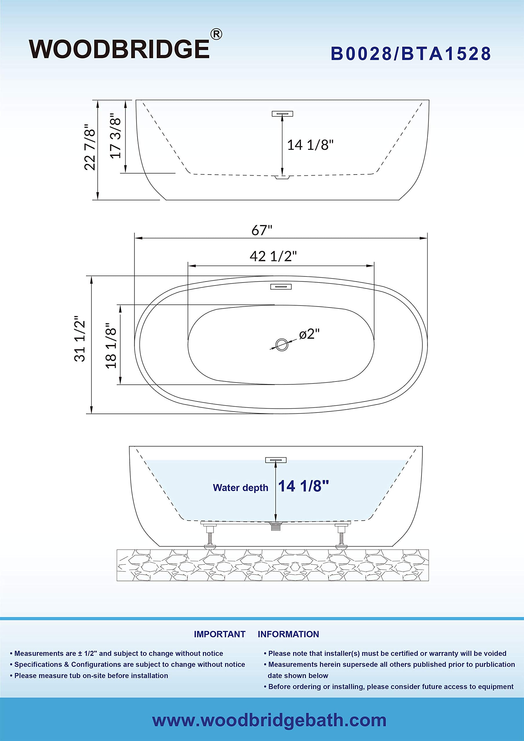 - [DIMENSIONS AND SPECIFICATIONS]: Exterior Dimension:Exterior Dimension: 67" Long x 31 1/2" Wide x 22 7/8" Deep, White Acrylic ( Matte Black Drain/Overflow)